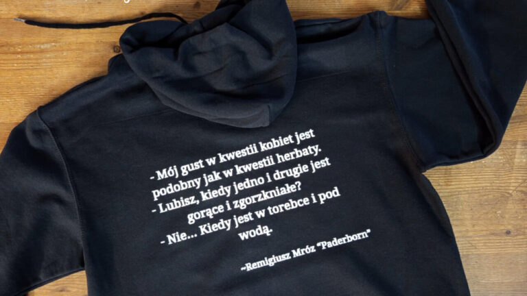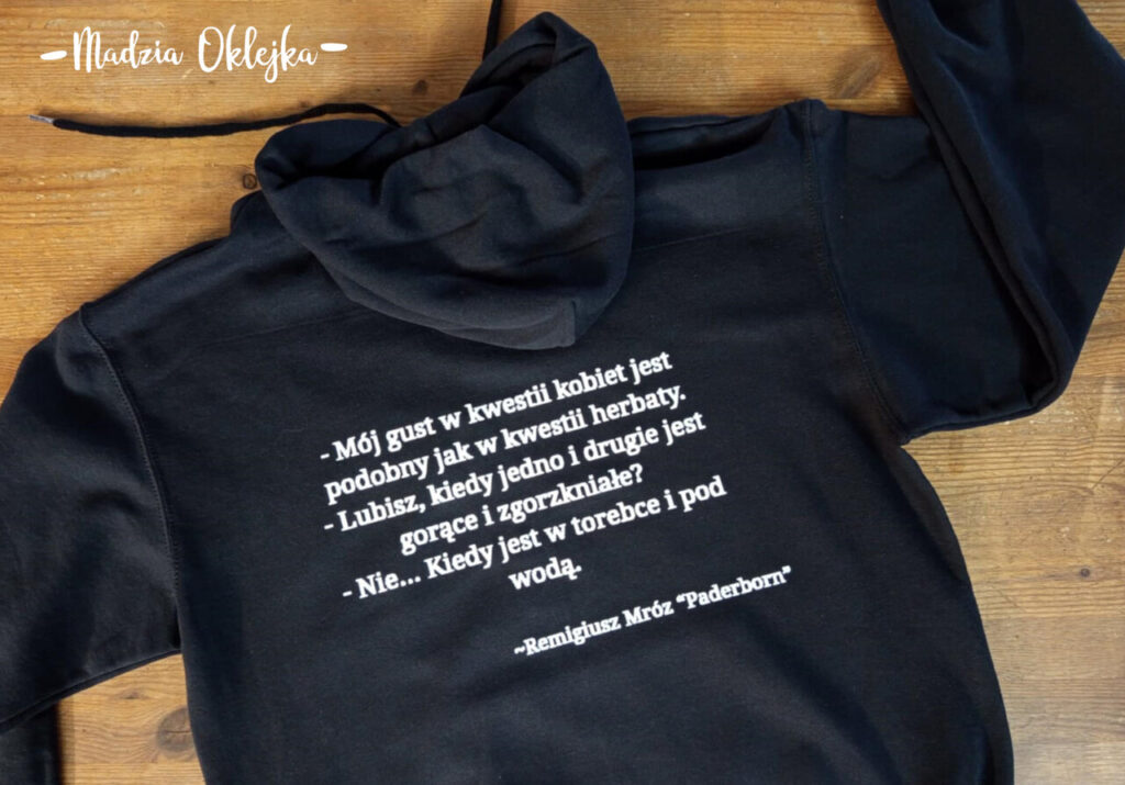 Mądre, kultowe, śmieszne i rozmaite inne cytaty drukowane na bluzach też fajnie wychodzą 🙂 Przykładem tego jest zamówienie od mojej klientki, pani Róży, która zawsze ma swój własny pomysł na nadruk dopasowywany do prezentobiorcy (nietrudno się domyślić, że taka bluza to świetny patent na udany prezent) a śmiechu co nie miara 🙂