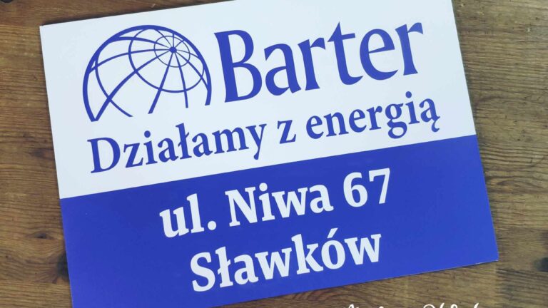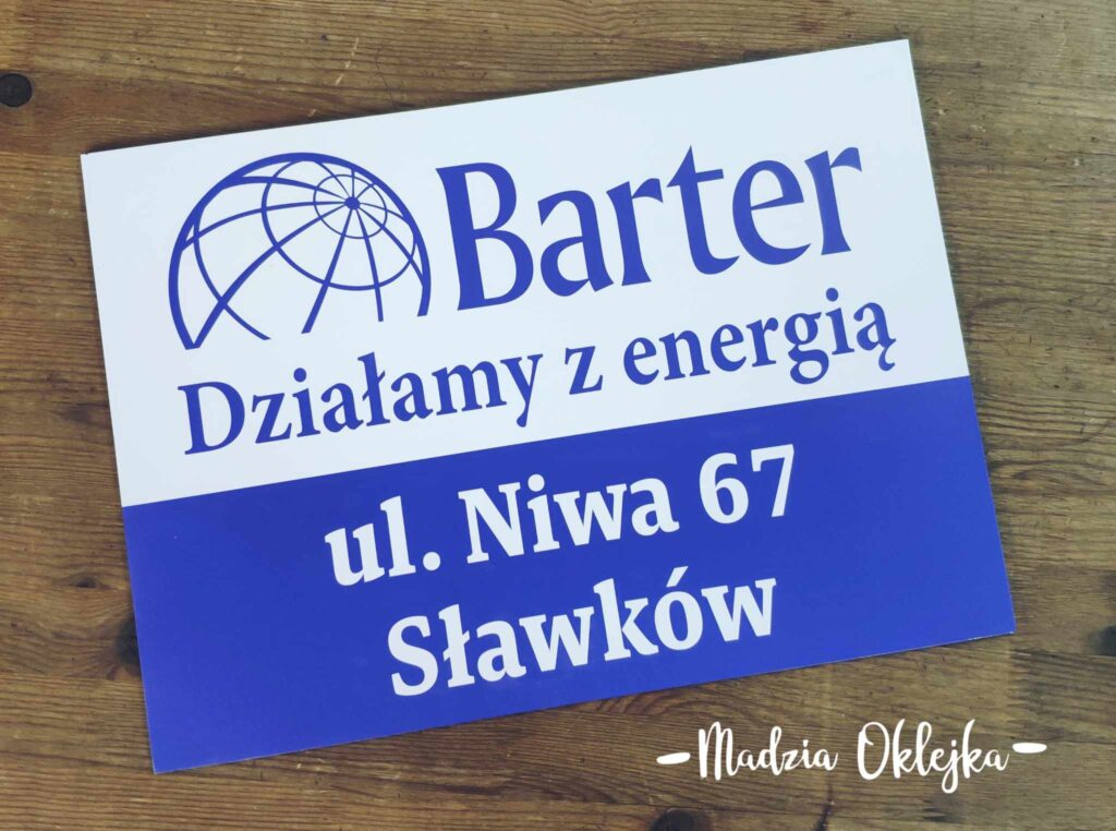Jak śpiewała Maryla: „ale to już było”. Tak, chociaż w międzyczasie przeszłam na nowocześniejszą metodę produkcji i tym razem szyld dla spółki Barter wykonany jest metodą nadruku UV z zachowaniem świeżości barw i doskonałą odpornością na warunki zewnętrzne. Dziękuję za zamówienie!