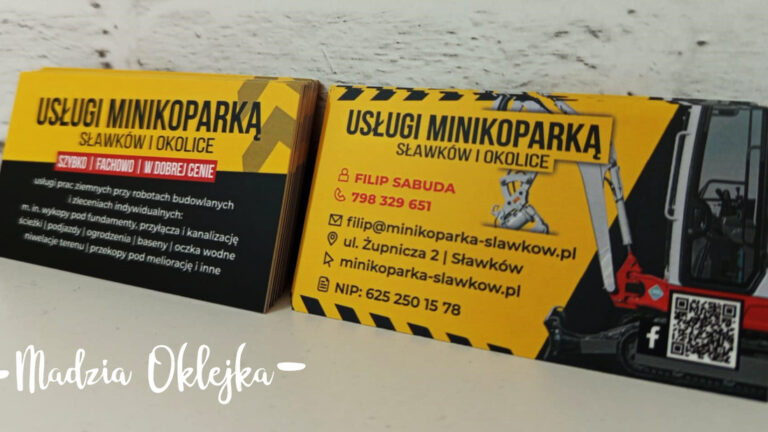 Dzisiaj wizytówki firmowe będące kontynuacją poprzednich realizacji dla przesympatycznego klienta ze Sławkowa od mini-koparki 🙂 Bazujemy na ustalonym designie, konsekwentnie powtarzanym m. in. na pojazdach oraz banerach. Wizytówki uszlachetnione foliowaniem matowym dla wzmocnienia ich trwałości oraz zwiększenia estetyki.